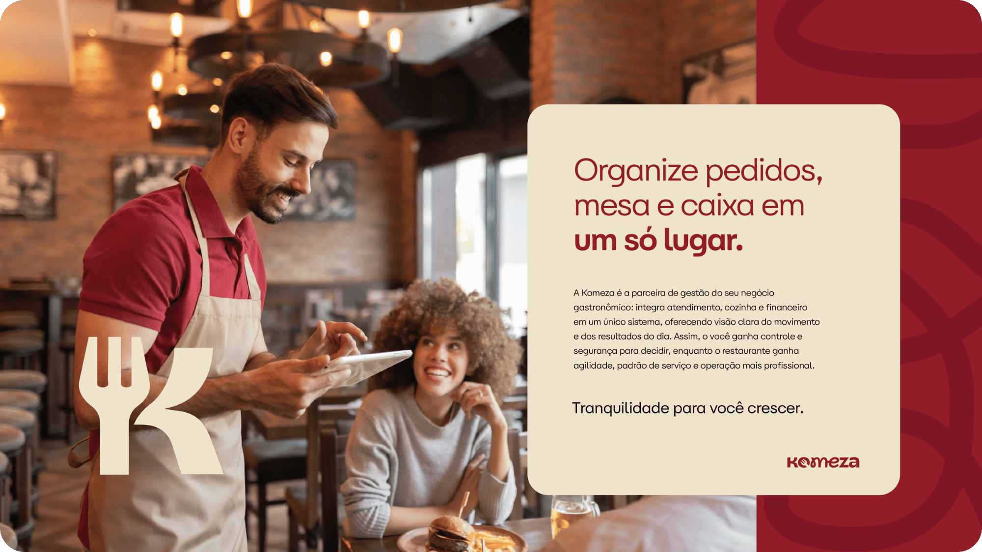 A Komeza nos procurou com o desafio de criar uma marca do zero para um sistema de gestão voltado a restaurantes, bares e operações de delivery. O objetivo era desenvolver uma identidade que conversasse com a rotina real da operação, trazendo agilidade, controle e clareza para quem está no balcão e no caixa, em tempo real.